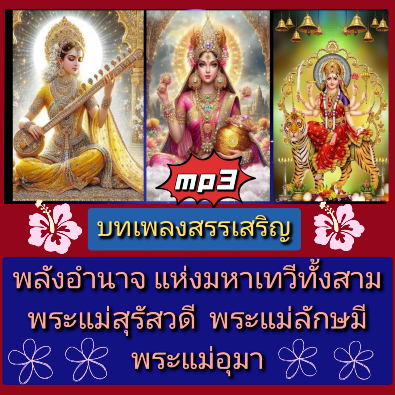 [พรเทวะ] แฟลชไดร์ฟ USB mp3 บทเพลงสรรเสริญ พลังอำนาจแห่งมหาเทวีทั้งสาม พระแม่สรัสวดี พระแม่ลักษมี พระแม่อุมา พระแม่สรัสวดี เป็นตัวแทนแห่ง ปัญญาความรู้ พระแม่ลักษมี เป็นตัวแทนแห่ง ความร่ำรวย พระแม่อุมา เป็นตัวแทนแห่ง ความมีอำนาจ ใช้กับเครื่องเล่น USB/mp3 ทุ